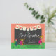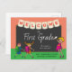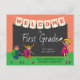 Welcome your students back to school with this whimsical postcard. The design features cute cartoon illustrations of children with backpacks and a teacher writing on a chalkboard welcoming her students to first grade. Personalize with the teacher's name and school.