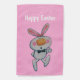 This outdoor hanging flag is vibrant pink with a cute cartoon white bunny rabbit giving a thumbs up sign wearing a black bow tie. Customize the Happy Easter text at the top with the template on front and back.
