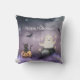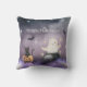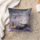 A cute black cat in a jack o’ lantern and a cute friendly ghost in a cauldron greet you Happy Halloween while stars, bats and a purple mist surround them.