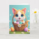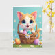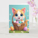 This card shows a cute, cartoon-style orange-and-white cat with soft shading, pink inner ears, and big turquoise eyes that glimmer as it smiles sweetly, like it’s sharing a friendly secret. The cat sits snugly in a woven wicker basket, with a small white daisy tucked along the rim as a gentle touch. A few pastel egg shapes in lavender and teal peek up from inside, lightly speckled and arranged close together for a cozy, togetherness feel 🐰. Behind the basket, the sky is a calm light blue with faint daisy shapes drifting like a soft pattern. Across the bottom, a rich green field stretches out, dotted with small white daisies that echo the flower on the basket 🌷. Lighting stays bright and even, adding tiny highlights to the cat’s eyes and giving the basket weave a textured, almost touchable look. Near the top, the greeting text sits centered in a light color that stands out clearly against the blue sky. The basket rests low in the scene, nestled into the grass with daisies scattered around its base and pastel eggs visible just behind the cat’s paws.