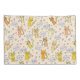Hand-drawn cute cat doodle pattern. Smiling, happy kitty cats with speech bubbles text such as Meow, Cute, Play, Love, Food, and Purr. The cat drawings are in different shades of orange, yellow, and a bit of brown with some stars and pink hearts.