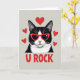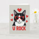 This sweet card features a charming tuxedo cat standing proudly against a soft, neutral background. Drawn in classic black and white, the cat’s personality shines through its curious expression and bold heart-shaped ruby glasses. Bright red hearts of varying sizes float around its head, creating a warm and affectionate mood. Beneath the cat, the message “U ROCK” appears in eye-catching red letters, making the sentiment clear and heartfelt. The strong contrast between the red accents and the black-and-white cat adds visual interest and warmth. From the fine whisker details to the balanced layout, this card feels joyful and loving, making it a wonderful choice for Valentine’s Day or anytime you want to show appreciation to someone special. ❤️💌🍫