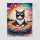 Am adorable cat in a doughnut on a fantasy float trip wearing sunglasses with a rainbow and clouds in the background