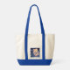 Love the durable cream colored canvas and navy blue contrasted handles. Perfect for carrying my laptop and papers.