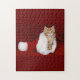 A jigsaw puzzle features a long-haired orange cat sitting inside a Santa hat. The cat has light orange fur with white patches and green eyes. The Santa hat is red with a white brim and a white pom-pom. The background is a dark red color. The puzzle pieces are small and have a traditional jigsaw puzzle shape. The image is well-lit and in focus. The style is realistic.