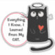 An angelic black cat wears a halo and carries a bright red heart on this cute "Cat Knowledge" sticker. Beside him is a banner lined in red that says "Everything I Know, I Learned From My CAT." Cute!