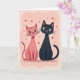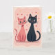 This very cute greeting card shows two cartoon cats sitting side by side on a soft blush-pink background. The cat on the left is rosy pink with small stripes on its tail and forehead, and it has big wide eyes and a gentle little smile. The cat on the right is jet black, posed the same way, with matching large eyes, a small smile, and thin whiskers. Around them, red hearts and small gold stars are scattered across the scene, giving it a sweet, romantic feel ❤️💌. The background has light wavy shapes that make the setting feel calm and cozy, like a quiet moment together. There isn’t any text printed on the card, so the two cats and the floating hearts do all the talking 🍫. Send it to someone you care about and let it help you share your Valentine’s Day feelings in a simple, heartfelt way.