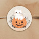 Get into the spooky spirit with these Halloween stickers featuring an adorable illustration of a white kitten sitting on a jack-o'-lantern pumpkin, surrounded by foliage. The design is done in soft pastel tones, adding a cute and playful twist to traditional Halloween themes. Perfect for decorating, scrapbooking, or personalizing your Halloween treats packages, these pastel Halloween kitten stickers are a fun and charming way to celebrate the season.