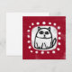 A cute drawn cat in black and white over a red textured background surrounded and white dots.
