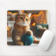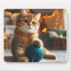 cute brown and white cat playing with a yarn mousepad. AI-generated artwork.