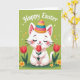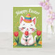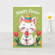 This design shows a rounded white cat-like character with eyes softly closed and rosy cheeks, holding a single red tulip close as if sharing a quiet, affectionate moment. A small cone party hat sits on its head, striped in yellow, blue, and pink, adding a light celebratory touch. Two more red tulips stand on either side, framing the character like friendly companions leaning in. The foreground is filled with green grass and tiny yellow flowers, giving the scene a gentle springtime feel 🌷. Across the upper area, a seasonal greeting appears in flowing cursive-style lettering, set in a darker green that contrasts against the background. Behind everything is a flat lime-green field with faint, pale triangular accents scattered around for extra texture. Soft shading and smooth color transitions give the character and flowers a cushioned look, and the red tulips pop brightly against the green backdrop. The hat’s stripes and the pale triangles repeat near the top, while the three tulips form a neat triangle around the character 🐰.