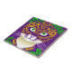 Ceramic tile in an image of a cute cat adorned in a mask in the festive colors of Mardi Gras. The blend of purple, green, and golden yellow,reflect the traditional hues of the celebration