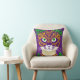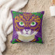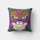 Throw pillow in an image of a cute cat adorned in a mask in the festive colors of Mardi Gras. The blend of purple, green, and golden yellow,reflect the traditional hues of the celebration