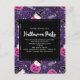 Halloween party invitation with an adorable Halloween themed pattern. Cats in witches hats, sitting on pink pumpkins with purple cobwebs in the background.