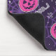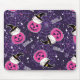 Mousepad with an adorable Halloween themed pattern. Cats in witches hats, sitting on pink pumpkins with purple cobwebs in the background.