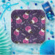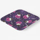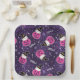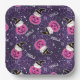 Paper plates with an adorable Halloween themed pattern. Cats in witches hats, sitting on pink pumpkins with purple cobwebs in the background.