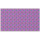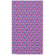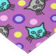 A 60” x 104” tablecloth featuring a cute, colorful pattern design of gray and teal cats against a purple violet background with multicolored polka dot accents.