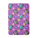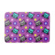 A medium size bath mat featuring a cute, colorful pattern design of gray and teal cats against a purple violet background with multicolored polka dot accents.