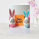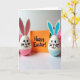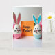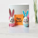 This card shows two egg-shaped bunny characters facing forward with wide eyes, tiny heart-shaped noses, and soft smiles that feel like they’re sharing a private, friendly moment 🐰. One bunny has pastel pink on its lower half and inside its tall ears, while the other mirrors it in light blue 🐇. Between them sits a bright orange rectangle like a little sign they’re presenting together, adding a cozy “we’re in this together” touch to the scene. A cheerful message is centered on the orange card in a casual, drawn lettering style, set in a dark ink that stands out clearly. Gentle lighting warms the painted surfaces and reveals small brush marks and slight imperfections that make the figures feel tender and cared for. The white tabletop below creates a faint reflection of the orange card and the bunnies’ colored bases, keeping the layout simple and airy. In the background, soft pink flowers appear slightly out of focus, framing the pair with a springtime glow 🌷.