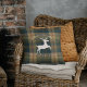 Beautiful classic dark green, burgundy red, and taupe tan beige brown Scottish checks pattern with seasonal silhouette image of a reindeer, and a classic fun Season's Greetings wish text. With room to customize or personalize with a family name and greeting of your choice. A classy winter December season design for the interior designer, or cottage country style lover who loves winter Christmas holiday themes. Original modern cushion for decorating the living room, family room, or bedroom of your log cabin, cottage, lake or river vacation home.