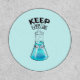 Cute chemistry patch for women in science with a nerdy smiling flask character with glasses and the funny text Keep Bubbling.