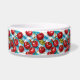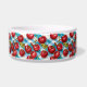 A watercolor ai illustration pattern of shiny red cherries, sage green foliage and blue checkered plaid pet bowl.