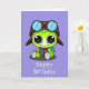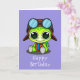 A cute chibi cartoon illustration. A green baby turtle wearing a blue scarf and brown aviator hat with goggles. Big wide kawaii eyes and an adorable smile. Happy birthday written on the front in a quirky font and a birthday message inside. Customize how you like.