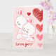 This Valentine's card features a vibrant handwritten typography "love you" with a cute chibi rabbit couple and red-pink scribble hearts.