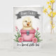 This card features a fluffy yellow hatchling peeking out of a pastel pink box, its soft feathers carefully shaded and its bright blue eyes turned upward as if chirping to someone it trusts 🐰. The little bird’s open orange beak and slightly tilted head give it a friendly, affectionate look, like it’s greeting a close friend. A small metallic clasp sits on the front of the box, adding a neat point of shine against the gentle pink. Around the center, pink tulips and rose blooms curl together with leafy green stems, creating a garden-like frame that feels tender and welcoming 🌷. The background is an off-white, lightly speckled surface that resembles textured paper and keeps the focus on the characters and flowers. Near the top, a gray ribbon banner stretches across with a short greeting in white lettering, and beneath it a second line of smaller gray text sits centered above the flowers. Soft spring lighting highlights the hatchling’s down and the petals’ edges, with the pink box nestled among the blooms and greenery.