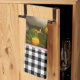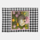 Pretty kitchen towel features a digital art painting of a baby chick among pink and yellow flowers with black and white gingham check border background.