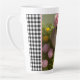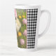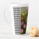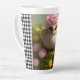 Pretty latte mug features a digital art painting of a baby chick among pink and yellow flowers with black and white gingham check border background.