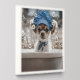 A cute little chihuahua puppy takes a bubble bath wearing a cute bathing cap bonnet. Great and whimsical bathroom art work.
