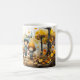 Mug featuring children going back to school in a fall landscape with flowers and butterflies. A cute mug, nice for children as well as adults.