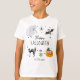 "Get ready for a hauntingly good time with our spooktacular Halloween party Tshirt! The design features animated icons such as bats, pumpkins, frogs, ghosts, spiders, and more for a frightfully fun touch. Personalized with your childs name and the year and the greeting happy halloween!"