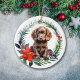 Here's a pretty Holiday ornament that is a wonderful keepsake for anyone who loves a Cocker Spaniel dog. The front has a watercolor image of a pine needle wreath, soft green leaves, red berries, and a red poinsettia blossom. A little black and red bullfinch bird perches on the wreath opposite of the poinsettia blossom. The highlight is the cute chocolate brown Cocker Spaniel puppy that sits in the center. The back of the ornament has the same wreath image, without the bird or puppy, but with two customizable text fields.