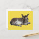 Cute chocolate donkey baby foal sleeping on yellow postcard