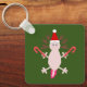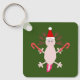 This fun double sided Christmas keychain features a digital art image of a cute Christmas Axolotl. The Axolotl is pale pink with bright pink gills. It is holding a red and white striped candy cane in each hand and is wearing a festive Red and white Santa hat. The axolotl is type of Salamander from Mexico. There is custom text on the back so you can personalize this design however you like.
