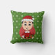 Throw pillow with an illustration of a cute smiling caucasian boy with short black hair, the boy is wearing a Santa Claus costume with a red hat and holding a present; in a red circle on green background with a seamless pattern with green and white stars,