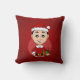 Throw pillow with an illustration of a cute smiling caucasian boy with short black hair, the boy is wearing a Santa Claus costume with a red hat and holding a present