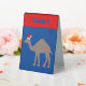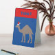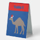 This awesome Christmas table tent sign features a digital art image of a cute sandy brown colored Dromedary Camel with beautiful long eyelashes and a single hump on its back. The camel is dressed ready for celebrating Christmas with a red and white Santa hat on its head. The camel features in the Bible and is a traditional symbol of Christmas. There is custom text on the front and back so you can personalize these fully.