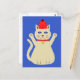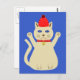 This awesome Christmas postcard features a digital art image of a cute Christmas Siamese Cat with beautiful blue eyes, brown claws, ears and whiskers and its front paws raised in the air. The cat is wearing a red collar with pretty white snowflakes on it and a beautiful golden bell. The cat is wearing a warm red bobble hat with white snowflakes on it to keep it warm in the winter cold.