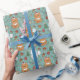 Premium wrapping paper with a whimsical repeating pattern of adorable cats in Santa hats amid gingerbread, trees, ornaments, and snowflakes on a festive teal background—perfect for cat lovers' gifts.