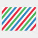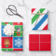 Cute Christmas Characters Wrapping Paper Sheets in Red, Green and Blue. 1st sheet features Christmas characters, 2nd Sheet has the same red, blue and green color stripes, 3rd sheet is red.