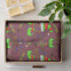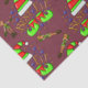 A cute and whimsical Christmas tissue paper featuring a pattern of friendly little elves and giant red and green Santa hats and pointy elf shoes, on a plum background, with gold stars and blue snowflakes and the words in gold: Best Elf.