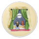 Ceramic knob with a whimsical watercolor painting. A young child in pajamas and her pet kitty cat looking outside their window on Christmas Eve. Santa Claus and his reindeer flying across the night sky in silhouette form with a big full moon illuminating their path.