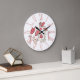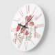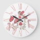 This whimsical Christmas wall clock features an enchanted woodland theme. An image of a cute fairy and butterfly are pictured fluttering amongst mushrooms and forest foliage. Two little candy canes are placed on either side, and pink glitter snowflakes are falling around. The hours are printed in a soft pink Roman numeral pattern.