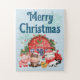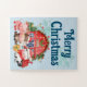 This custom Christmas holiday puzzle features a cute watercolor cartoon illustration of a farm. Little baby farm animals are dressed in Santa hats outside of a country farmhouse. The background is a light blue color.