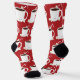 Christmas socks with a pattern that features a smiling mug of hot cocoa with a candy cane and several cheerful marshmallows on a red background. Add a pair or two to your cart, get them home, then enjoy them on your feet!