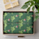 Awesome green dinosaur Christmas tissue paper. This apatosaurus looks very cute in a holiday red Santa hat with a little smile. I like prehistoric Christmas animals and presents that kids will love.