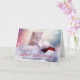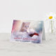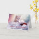 A personalized Christmas holiday folded greeting card. Designed with a photograph of a ginger kitten sitting on a soft white and red Santa hat. Blurry glittering lights bokeh background. Personalized message on the inside of the card.